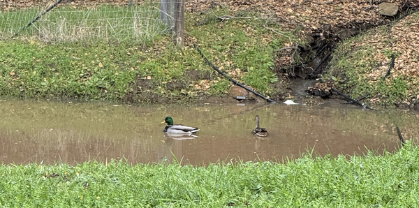 On my walk, I saw that our little seasonal pond has been filled from the recent showers. A pair of Mallard ducks were swimming around in it, and